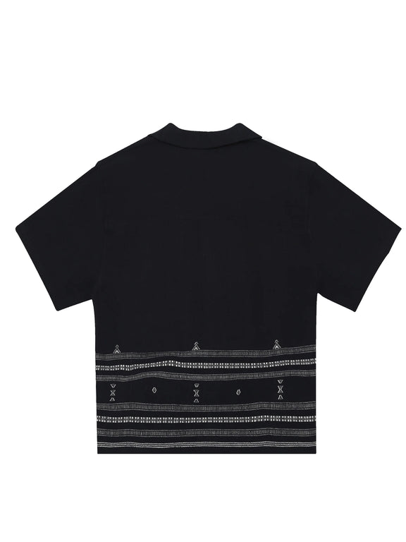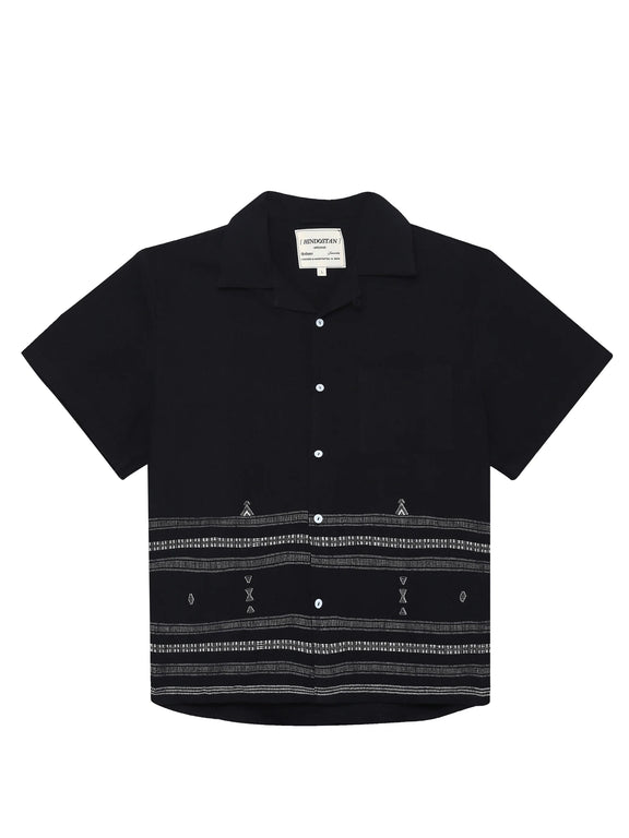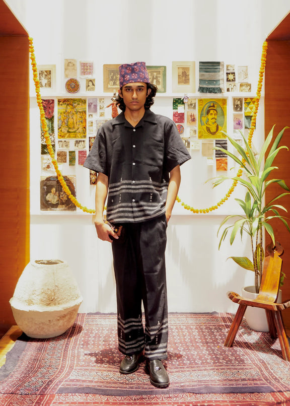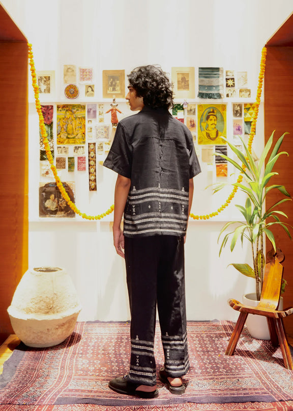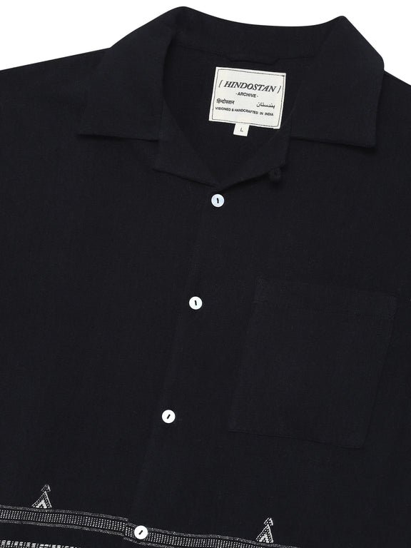 Handwoven naturally yarn-dyed shirt is made of hand-spun organic cotton with Bhujodi weave motifs at hem.