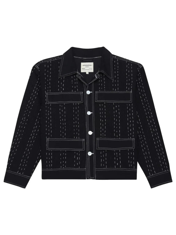 A four-flap jacket with plain-woven cotton fabric and hand-done Kantha embroidery throughout the surface.