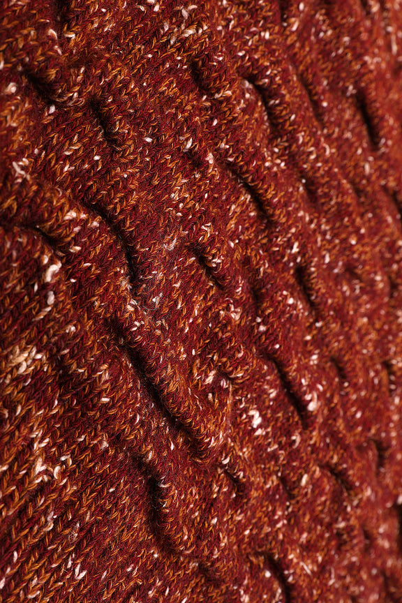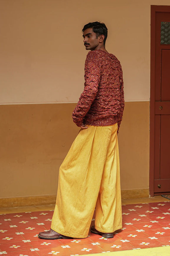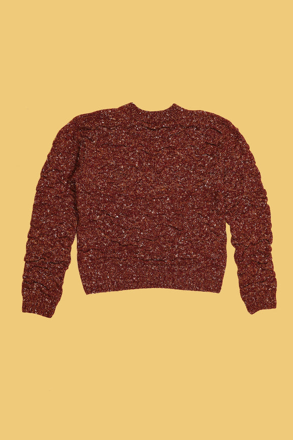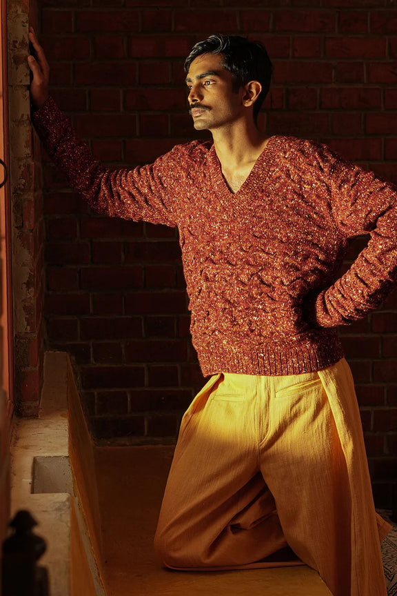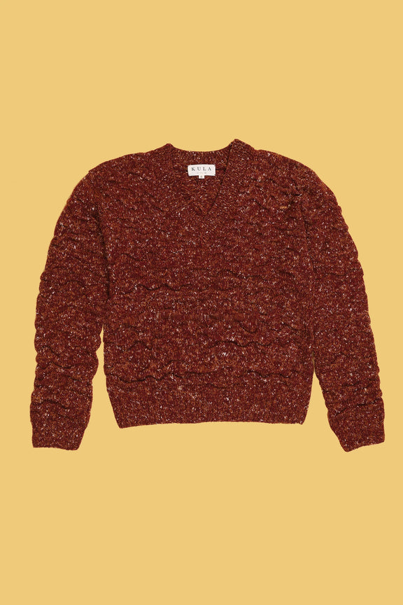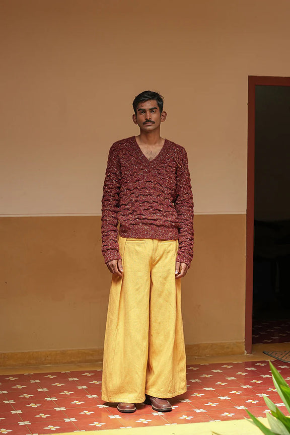 V-neck sweater is hand-knitted using 100% merino with a blend of biodegradable dyes. Irregular 3D bubble-like stitch knitted with blobby merino yarn. Relaxed fit with dropped shoulders and elongated sleeves.