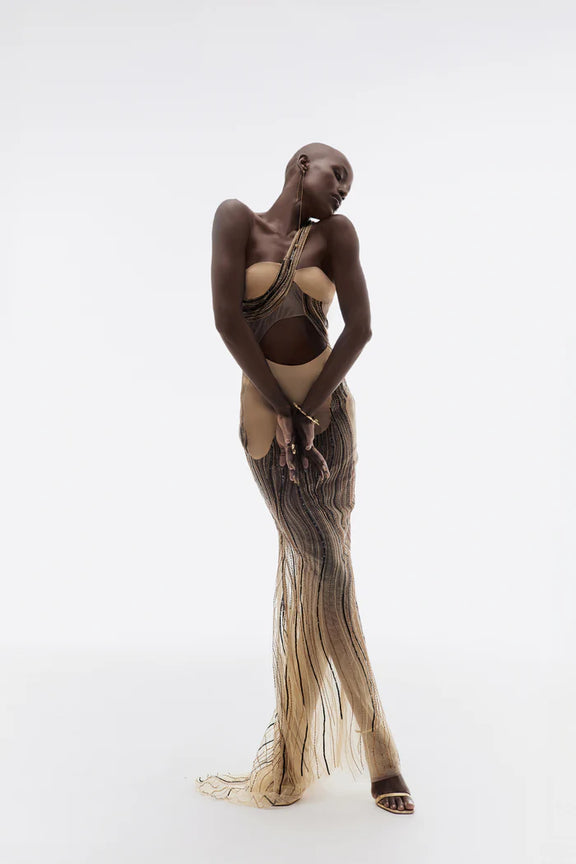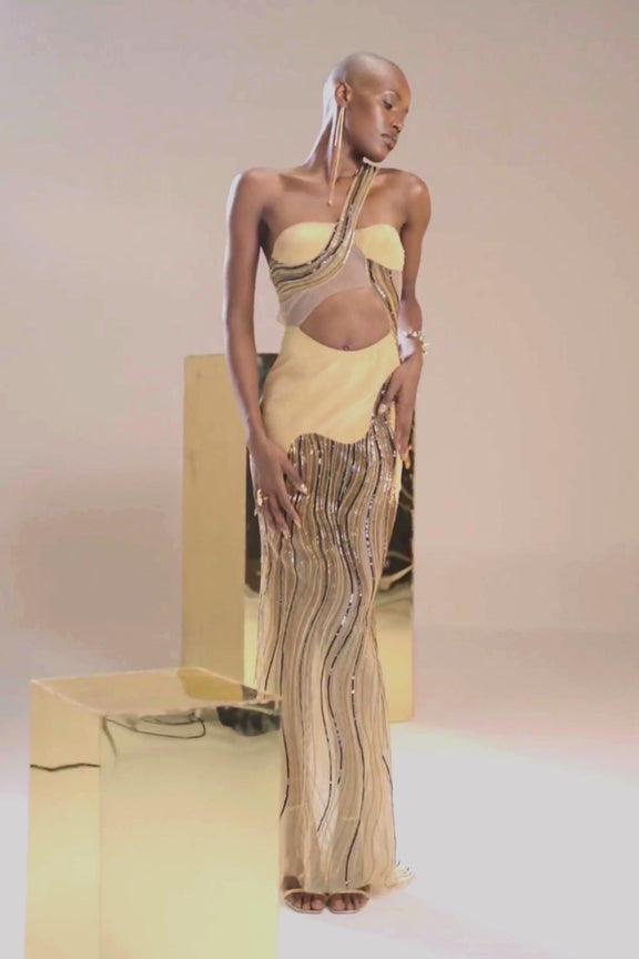 This riveting dress features curved paneling that contours the body along with skillfully crafted cut-outs at the front and back. Adorned with beads and sequins from a dense-to-scattered pattern, combining crepe and net fabrics into a delicate contrast. The sheer bottom transitions into a fishtail shape, extending at the back on the floor into a trail.