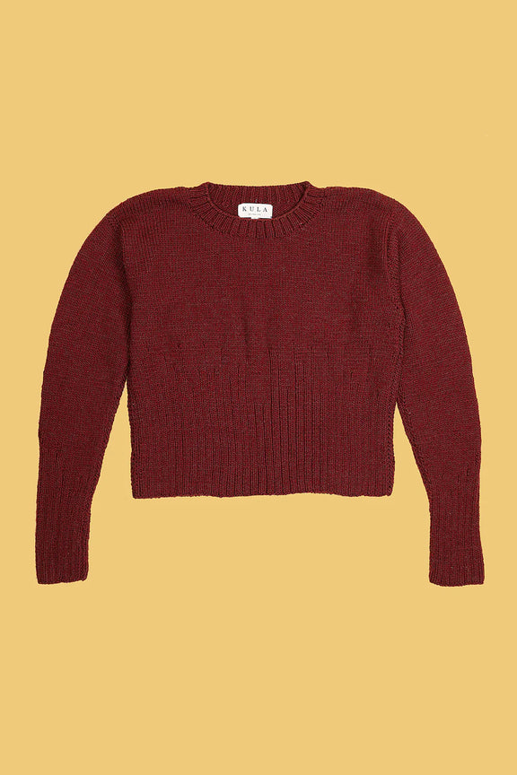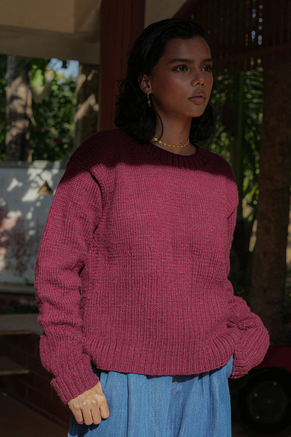 Hand-knitted sweater made from 100% merino wool and dyed with biodegradable dye. Features a relaxed fit with elongated sleeves and an irregular rib at the bottom.