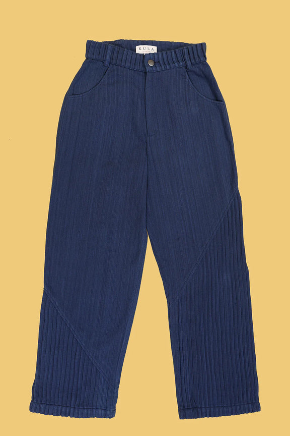 These are hand-woven 100% cotton denim pants dyed with indigo with irregular pleats all over the bottom and the yoke. Mid rise, relaxed fit, and straight leg.