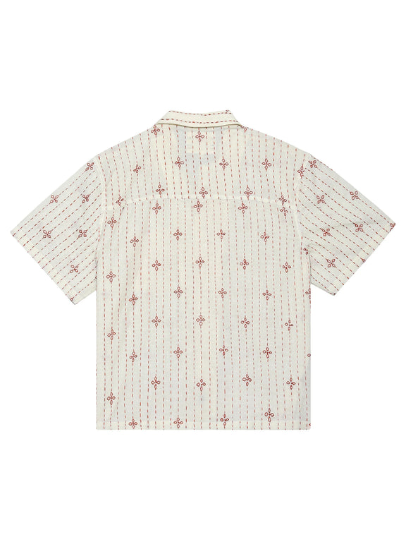 This is a plain-woven half-sleeve linen shirt with hand embroidery done throughout by our in-house artisans.