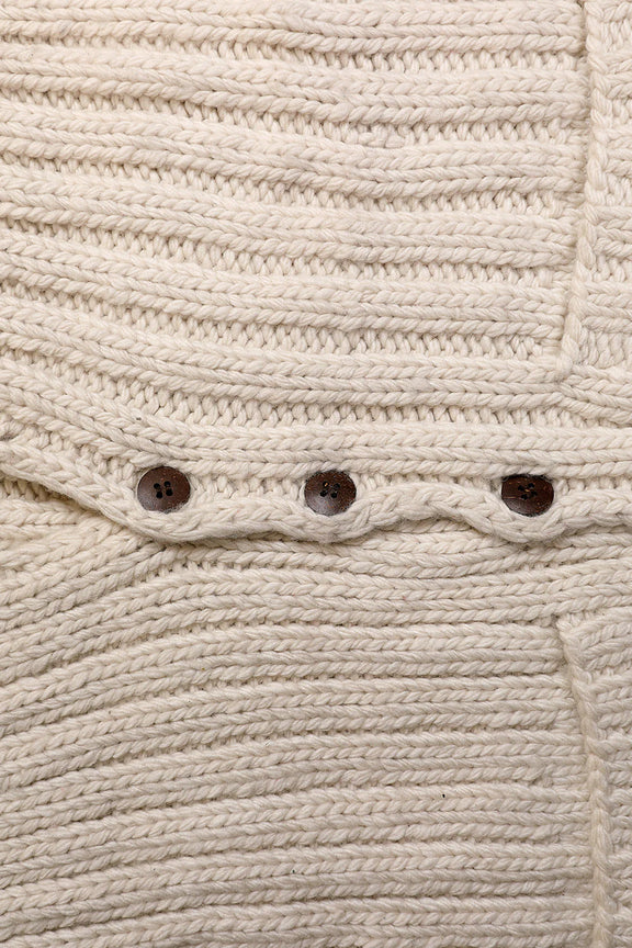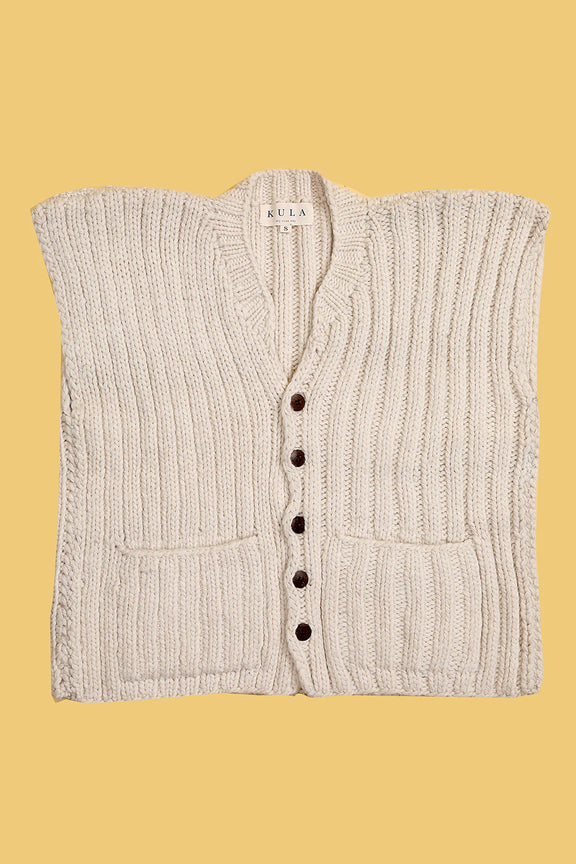 The cardigan vest is hand-knitted using 100% merino wool. It features a relaxed fit with dropped shoulders and coconut wood buttons. The different rib structure on the front panels balances with the variations in ribbing on the back panel.