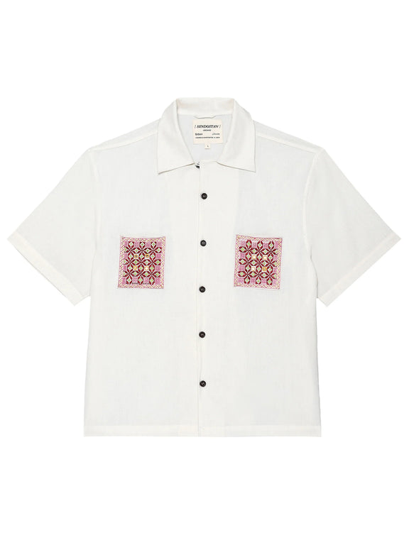 Plain-woven organic khadi cotton camp-collar shirt with Suf hand-embroidery on patch pockets at front.